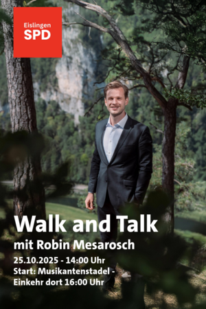 Bei dem neuen Format „Walk and Talk“ lädt die Eislinger SPD dazu ein, gemeinsam mit ihrem Gast Robin Mesarosch zwei Stunden durch das Täle zu spazieren und dabei über aktuelle bundes- und landespolitische Themen ins Gespräch zu kommen.