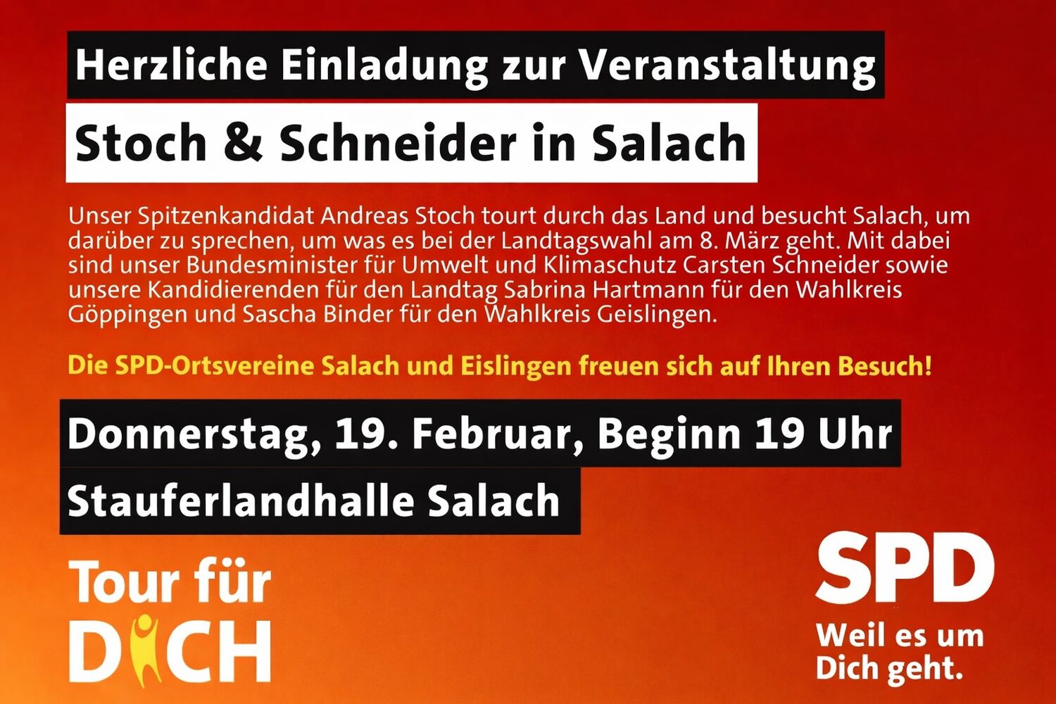 Deshalb laden wir alle Interessierten herzlich ein, ihre Perspektiven in unsere kommende Dialogveranstaltung einzubringen. Unser Spitzenkandidat und SPD-Landesvorsitzender Andreas Stoch und unser Bundesminister für Umwelt und Klimaschutz Carsten Schneider kommen zu uns nach Salach, um zuzuhören und Antworten zu geben.
